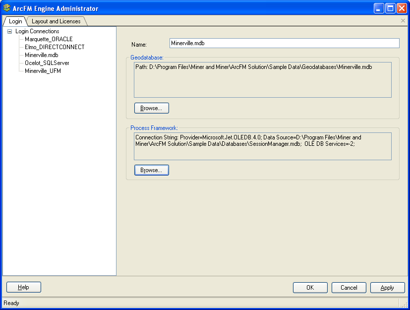The Login tab provides access to the DatabaseConnections.xml (Program Files\Miner and Miner\ArcFM Solution\Bin\Xml). If this file or its parent directory is Read Only, you may not edit existing connections or add a new one. |