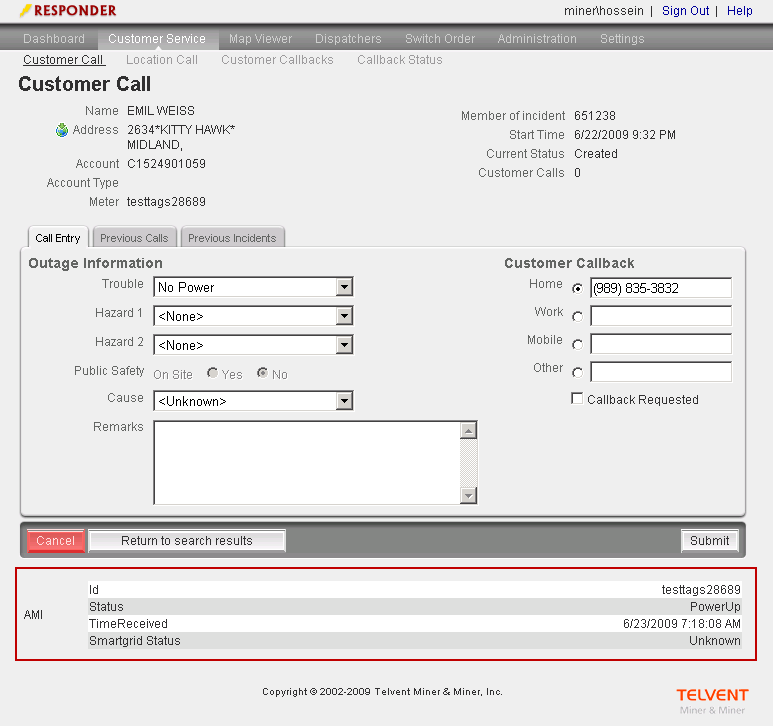 You can modify the Responder web configuration to display AMI event information for customers included in an incident originated with an AMI event (see example below). AMI event information is displayed on the Customer Call page and is available for the customer service rep as he enters call information. Follow the steps on this page to enable the display of this data.
