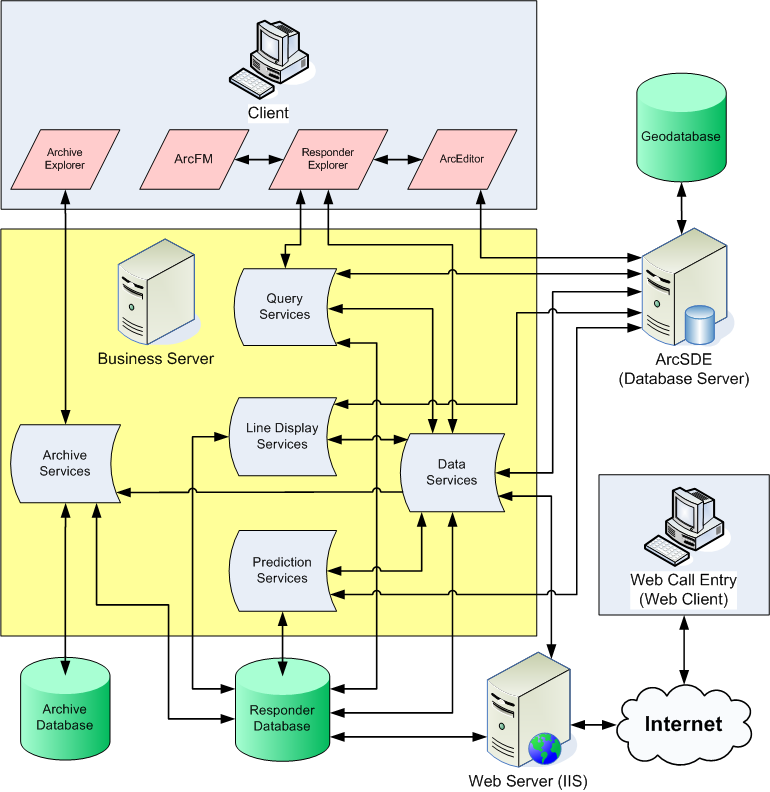 Responder is an outage management system (OMS) that allows utilities to track incoming calls from customers and create outage incidents in ArcMap. Below is an example of how Responder may work and how the various servers and databases are involved. Responder is highly customizable, so your architecture may be different.