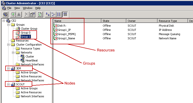 Group: Each virtual server in the cluster is represented by a group. When failover occurs, the entire group will failover. Windows Server 2003 resources may use the terms: group, cluster group or resource group. For consistency, this document will always refer to the item that represents a virtual server in the cluster as a group.