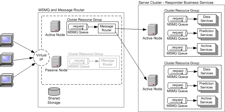 In order to permit scaling-out, Responder uses a component called a Message Router to route messages from the client facing queues to the back-end Responder services (e.g., Data Services, Prediction Services). The image below shows the Message Router component in a group (to allow for failover) forwarding messages to additional server machines that participate as active nodes in an active/active server cluster. If an active node (in the responder business services cluster) fails-over then its resources will transfer to another node. (Only two nodes are shown in the active/active cluster, but Windows Server 2003 supports up to eight nodes. This may vary for different OS versions.)
