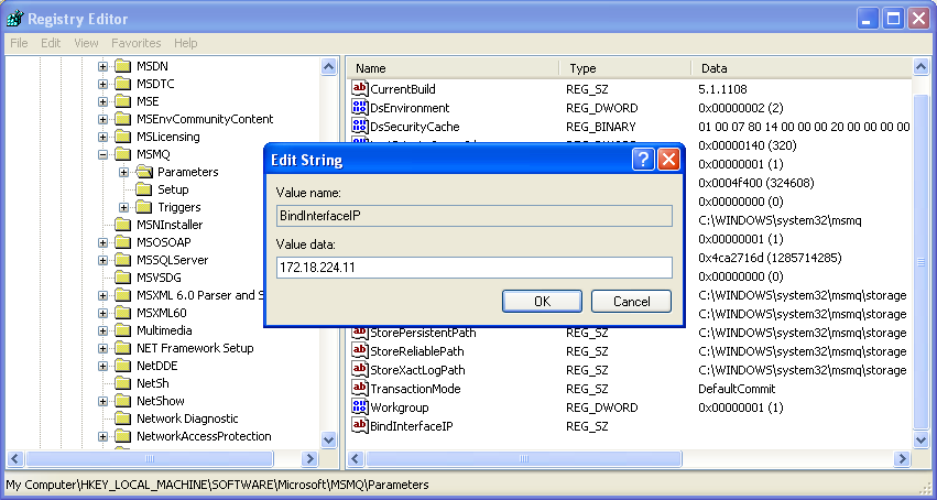 Note that there is a registry key (discussed above) to control the network interface binding in MSMQ, but it does not work properly under Windows XP.