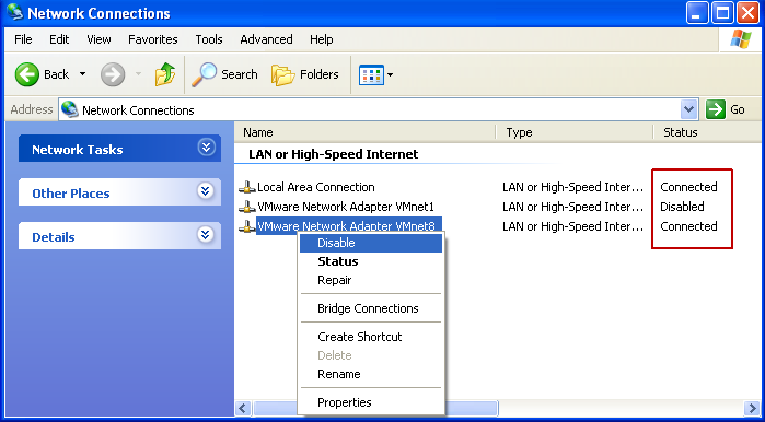 - Right-click the network interface and select Disable. In the example below, note the Status column. All extra network interfaces should be disabled.