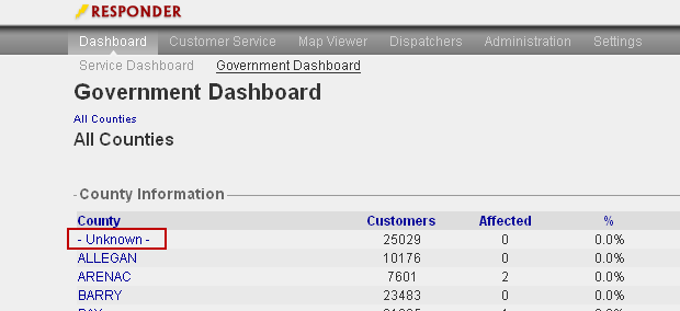 When no region is assigned to an incident, the Region value is defaulted to -Unknown-. The same applies if you have configured Responder to use counties and cities. -Unknown- is the default for all three. You can remove the -Unknown- value from the reporting fields on the Service Dashboard as well as the optional Government Dashboard.