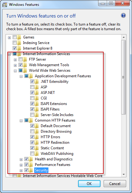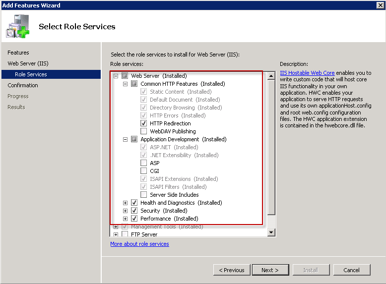 - Select the checkboxes for Web Server (Installed) as shown in the image below. This is the minimum requirement for Responder.