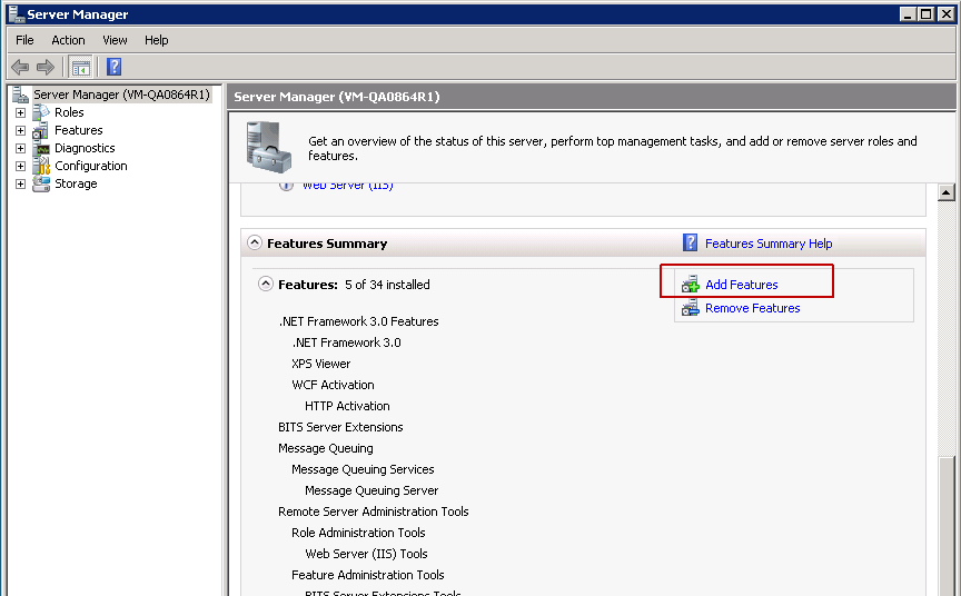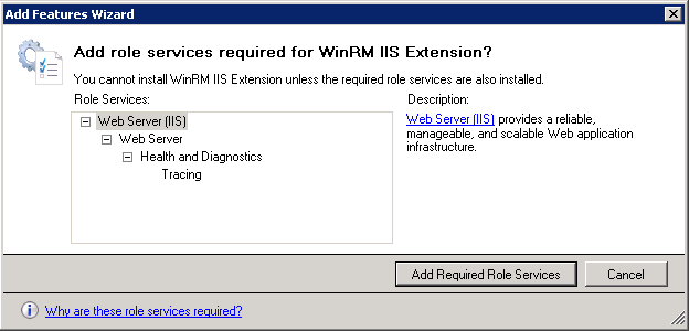 - Select the Web Server IIS Extension checkbox (or WinRM IIS if installing on a remote machine). The Add Features Wizard window opens.