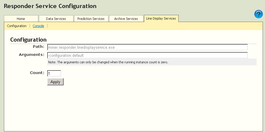 Line Display Services is responsible for including the line energization state on the map. Use the Line Display Services tab to configure, manage and execute Line Display Services. By default, the Configuration window opens. Click the link to Console to manage your Line Display Services. At least one Line Display Services instance must be running in order to use the console (i.e., the Count field must contain a value greater than 0).