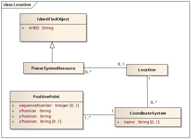 - PowerSystemResource: A power system resource can be an item of equipment such as a Switch, an EquipmentContainer containing many individual items of equipment such as a Substation. A power system resource can have a location.