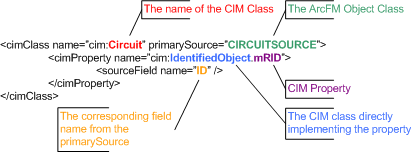 In this example, the mRID CIM Property, in the IdentifiedObject abstract class (as a defined CIM Class), corresponds to the ID field from the ArcFM Object Class of CIRCUITSOURCE. Therefore, ultimately, mRID (CIM Property) = ID (ArcFM Field) for the Circuit CIM class.