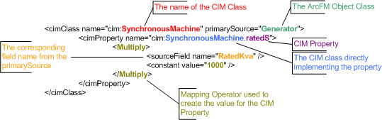 In this example, the Multiply Mapping Operator applies to all the child elements between the Multiply operators. Therefore, the ratedS (CIMProperty) = RatedKva (ArcFM Field) X 1000 for the SynchronousMachine class. See the list of Mapping Operators here to apply to the mapping XML.