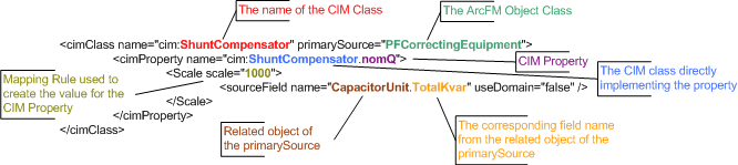 In this example, the PFCorrectingEquipment object class has a related object of CapacitorUnit, which contains the TotalKvar field that CIM's nomQ property will be replaced with when multiplied by 1000.