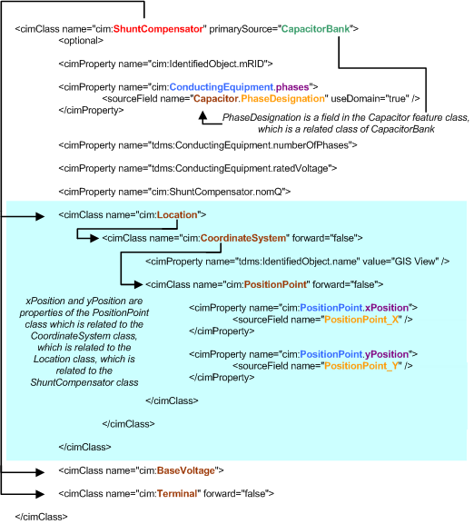 CIM classes can have related classes as well. In the example below, Shunt Compensator has related classes of Location, BaseVoltage, and Terminal. Even the related cimClass of Location has its own related class of Coordinate System, which has its related class of PositionPoint.