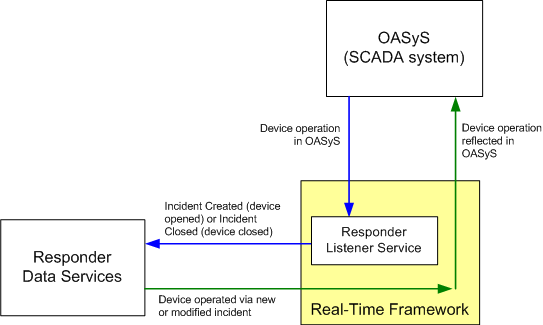 OASyS provides telemetry data for devices in the field. Responder can be integrated with OASyS and receive device operation data from the field. For example, if a device is Opened in the field, the Responder Listener relays this information from OASyS to Responder Data Services. If the incident is resolved in Responder and the device Closed, OASyS is notified via the Real-Time Framework installed with Responder Server.