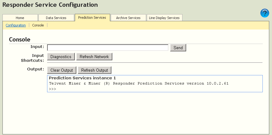 Use the console to manage your existing instances of Prediction Services. If you are running multiple instances of Prediction Services, there will be multiple console windows (one for each instance). If you wish to use a command, enter it in the Input field and click Send. The results of the command are displayed in the windows for each Prediction Services instance running. The various commands you can use in this window are listed here.