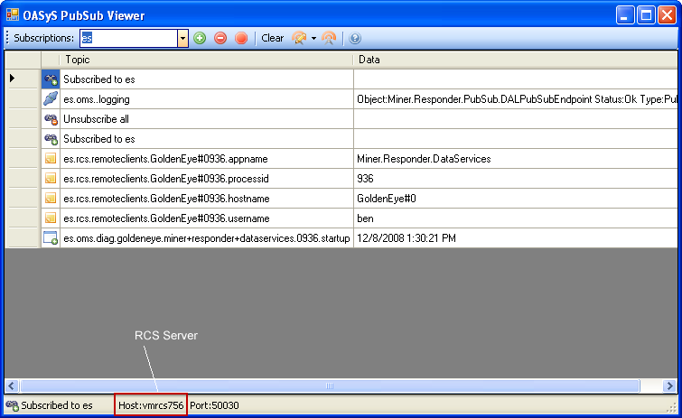 The grid shows all messages that travel through PubSub. The status bar at the bottom displays the current subscription as well as the name of your RCS server.