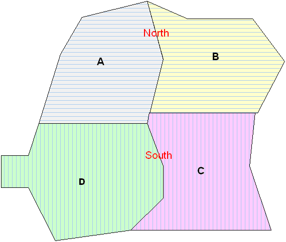 In the example below, the largest polygon contains two mid-sized regions (North and South) as well as four small regions (A, B, C, and D).