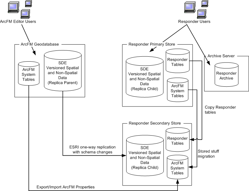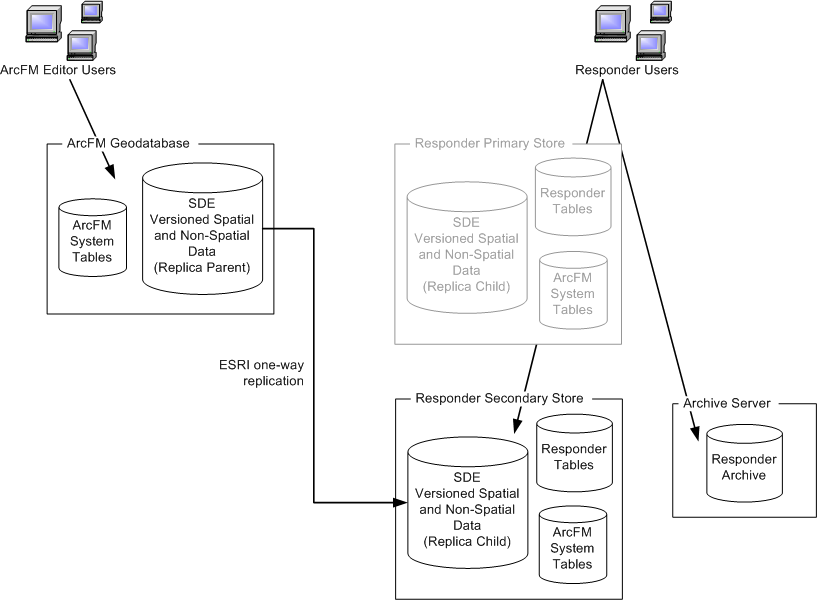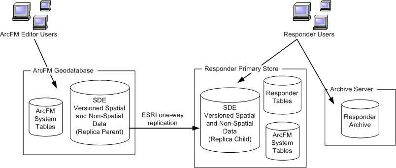 In the initial state (Figure 1), Editors work in one SDE database while Responder users typically use another. Esri replication may be used to maintain an updated version of the SDE geodatabase for Responder users.
