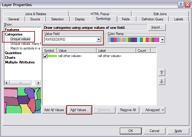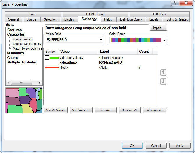 You can determine how Responder Line Displays appear on the map. This section discusses an example of how you might set up this symbology. Responder recognizes three types of lines: normal state, de-energized and differently energized. De-energized means the line is getting no electricity and the RxFeederID field will always be Null to indicate this. Differently energized means the line is being fed in some way that's not usual (e.g., backfed or multifed). The RxFeederID field will contain the value of the feeder providing electricity to the line. You can create separate layers in ArcMap to display the Responder Line Display symbology for each of these types of lines.