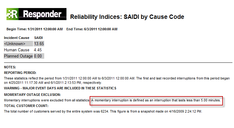The above XML indicates the minimum number of outage minutes an incident must have to include in the Reliability Indices: SAID by Cause Code report is five. By default, reports with momentary interruption filters have a value of five minutes.