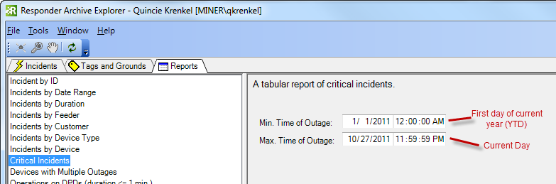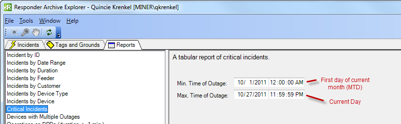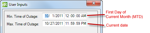This optional configuration allows you to determine how default dates are displayed on User Input windows in Archive Explorer. For example, the input window for the Incidents by Date Range query (shown below), displays by default today's date in the Max. Time of Outage field. Because it has been configured to show month-to-date, the Min. Time of Outage field defaults to the first day of the current month.