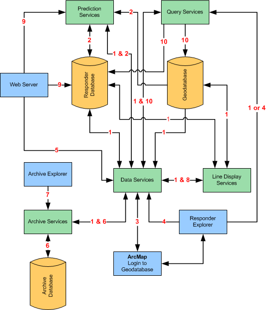 Responder requires four components: Web Server, Data Services, Prediction Services, and ArcMap. These may be installed on the same server or different servers. Generally Data Services, Line Display Services, and Prediction Services are installed on the same server (Responder Services). The diagram below displays the configuration for Responder to work properly with ArcMap. Each arrow indicates the component to which the file should point.