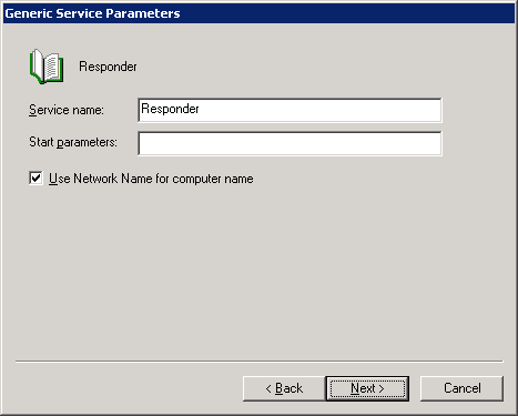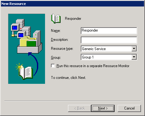 Next you will create the resource for the Responder Windows Service using the Cluster Administrator. Perform these steps for each group. These steps make the Responder server work with a cluster.