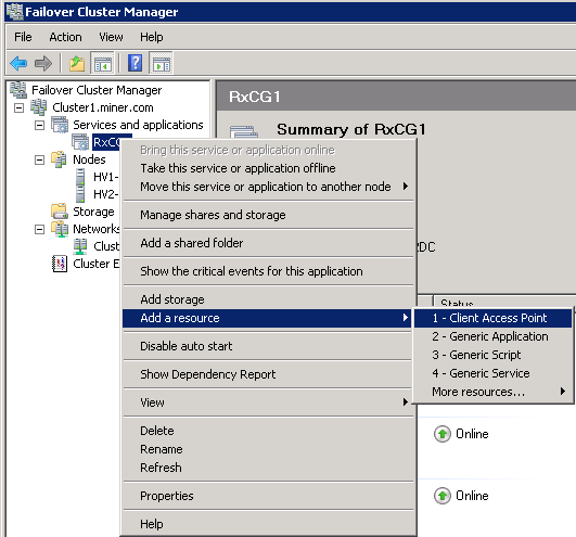 - Right-click RxCG1 and select Add a Resource, then Client Access Point.