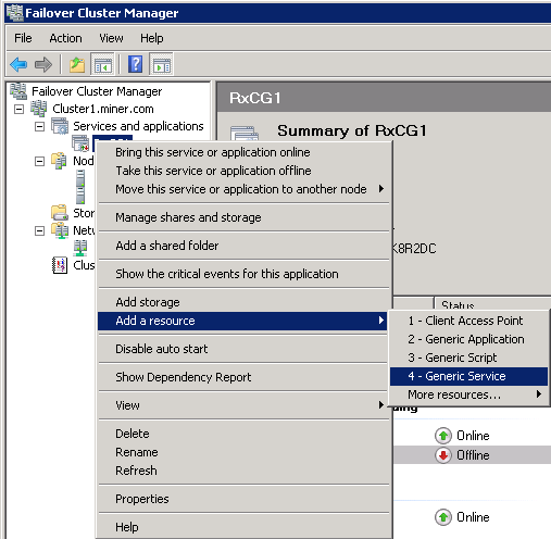 - Right-click RxCG1 and select Add a Resource, then Generic Service.