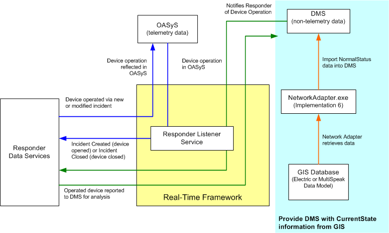 Integrate Responder with OASyS to access telemetry data. Network Adapter may be used to supply DMS with NormalStatus information from the GIS database. You can choose to integrate with either OASyS or DMS, or both. If you elect to integrate with both, the process flow will be similar to Figure 1. These configurations are discussed in this section. In order to provide NormalStatus information to DMS, you will need to configure Network Adapter Implementation #6.