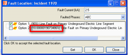 When you execute the Get Fault Location tool, you are presented with one or more options identifying possible fault locations. The percentage in parentheses after each option is the probability precision. It indicates the likelihood of that option being the correct fault location. You can determine the number of decimal places used with this percentage. By default, the probability precision will be two decimal places. Note that if the first decimal places to be shown are all 0, then they will not be displayed at all.