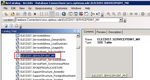Do I have a multi-versioned view? In ArcCatalog, look for an object named similarly to your ServicePoint feature class. This object will likely have a suffix of _MV. This object will not reside in the dataset next to the ServicePoint feature class, but rather in the root of the geodatabase. In the example below, the multi-versioned view is named ELECDIST.SERVICEPOINT_MV. The feature class used to create this view is called ELECDIST.SERVICEPOINT.