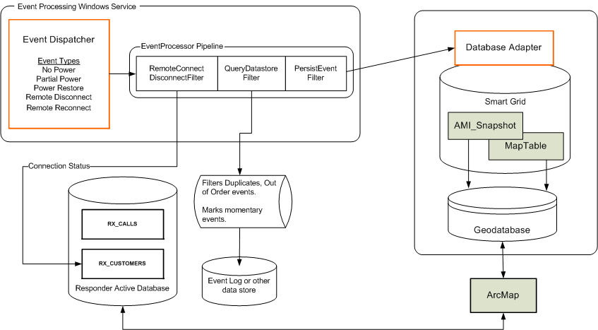 Once messages arrive in the state data store the Smart Grid Integration Framework uses database triggers to map the meter events to GIS features in the geodatabase, which may be used to display AMI events. Database triggers maintain accurate data in the AMI Events feature class from the AMI_Snapshot and MapTable tables to ensure that ArcMap reflects the current status of the meter.