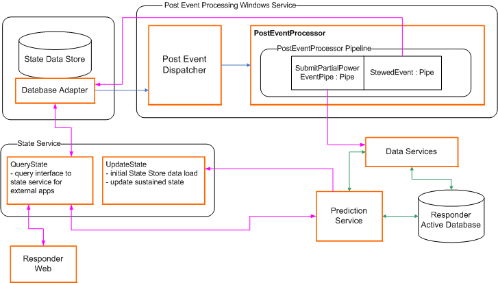 Next, the PostEventProcessor queries the state data store (Oracle) for new events. The PostEventProcessor's PostEventDispatcher component queries the state data store at set intervals and pulls all unrestored power down and unrestored partial power events that have waited the pre-determined (via configuration) amount of time. A second query pulls power down and partial power events that were restored by Responder but not by AMI after these events have been held a pre-determined (via configuration) amount of time.