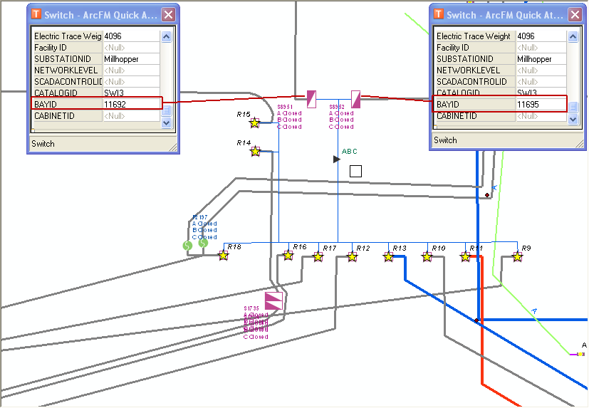 If the substation has multiple entry or exit points, each feature that represents a bay (i.e., entry or exit point) into or out of the substation must have a BayID assigned. The BayID field must have the BAYID field model name assigned. In the example below (figure 3), the two switches at the top of the diagram are bay features and serve as entry points into the substation. As the Quick Attribute Viewer screens depict, each of these bay features has a BayID assigned. The BayIDs on these features correspond to BayIDs on features in DMS. The DPD features (indicated by stars on the diagram) act as feeder subsources. These are considered feeder bays and identified by their FeederID values.