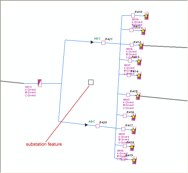 In the geodatabase, a substation is represented as a point feature that has relationships with all of its internal features. A substation is a point feature that has the SUBSTATION model name assigned. Your geodatabase may contain multiple feature classes (e.g., substations, switching facilities) with the SUBSTATION model name assigned. Figure 1 shows the substation point feature in the middle. The three gray lines coming into and going out of the substation represent feeders, which are not related to the substation. The Dynamic Protective Device (DPD) features connected to the feeders are feeder subsources (this database is configured to use EFM) and are related to the substation. The rest of the features (e.g., fuses, busbars, transformers, switches) are internal to the substation.