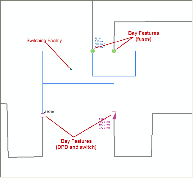 The dynamic protective device and switch at the bottom of the diagram and the two fuses at the top of the diagram are all bay features. This means they connect to features that are not related to the substation (i.e., external features). The fuses connected to the feeders are NOT feeder sources. In the example below these bay features connect to feeders (the gray lines) that are not related to the substation. Because there are multiple and they are not feeder bays, all bay features have BayIDs assigned.