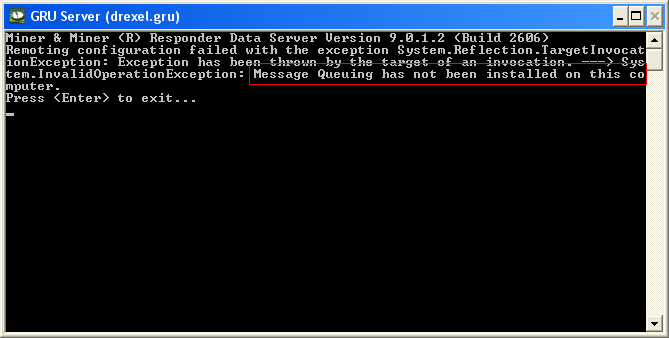 Fix: MSMQ must be installed in order for the server to start up and run correctly. Refer to the Configuring Responder online documentation for more information.