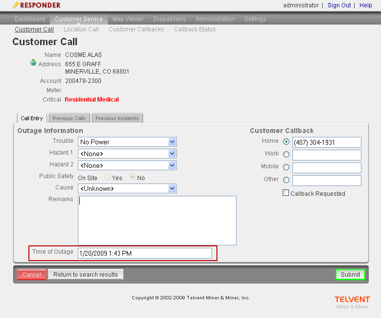 This optional configuration displays a Time of Outage field on the Customer Call form and allows the Customer Service Representative (CSR) to modify this value. For example, a customer may call in to report an outage that began an hour earlier than the call time. The CSR can modify the Time of Outage field to reflect the earlier outage time.