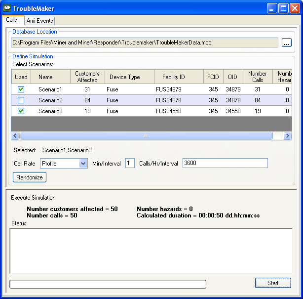 Responder's TroubleMaker application allows utilities to use customer call information to simulate a call submission environment for dispatcher training or performance testing. TroubleMaker uses the call information in your database to submit calls to Responder. You may also use the AMI Events tab to simulate AMI events from meters.