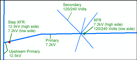 In the example below, the step transformer at the far left (in red) has a high side voltage (operating voltage) of 12.5kV and a low side voltage of 7.2kV. The step transformer's high side voltage matches the operating voltage of the upstream primary and the step transformer's low side voltage matches the operating voltage of the downstream primary (7.2kV).