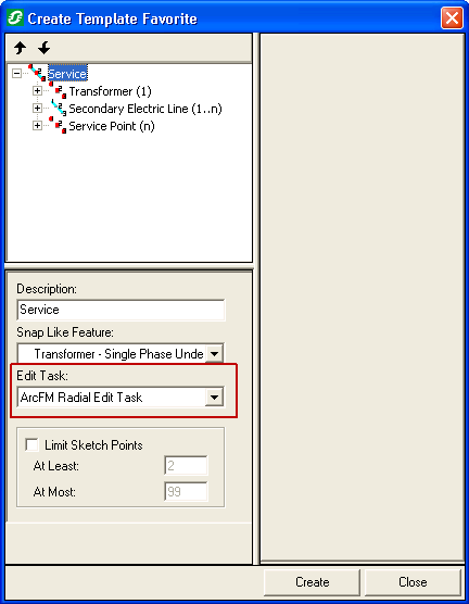 To start, select ArcFM Radial Edit Task as the template's edit task to enable it when placing linear features with a single origination and several end points.