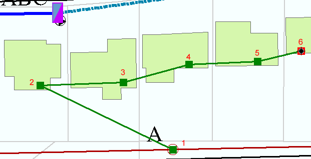 The ArcFM Radial Edit Task will place the secondary from the first point (1) to each of the end points (n) the user indicated (clicks 2-6). A service point will be placed at each end point (n).