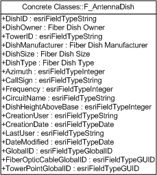 Attributes (required fields in red): DishID: text - This field contains a unique name assigned to a dish. DishOwner: text - This field contains the owner of the dish. It uses the Fiber Dish Owner domain. TowerID: text - This field contains a unique name assigned to the tower to which the dish is attached DishManufacturer: text - This field contains the name of the dish manufacturer. It uses the Fiber Dish Manufacturer domain. DishSize: text - This field contains the diameter of the dish and is represented as inches in the US. It may be represented as centimeters in most other countries. DishType: text - This field contains the style of dish. It uses the Fiber Dish Type domain. Azimuth: long integer - This field contains the direction in which the dish is pointed. This value is expressed in degrees. It can be used to determine the microwave path between two antenna dishes on separate towers. CallSign: text - This field holds a value that uniquely identifies the antenna, which is registered with the Federal Communications Commission (FCC) in the US. Frequency: long integer - This field stores the wavelength broadcast and received by the microwave dish. CircuitName: text - This is the name of the fiber optic circuit that this dish completes via a microwave link. DishHeightAboveBase: long integer - This field contains the height (usually represented in feet in the US; meters in other locations) at which the antenna is installed as measured from the base of the tower. GlobalID: GlobalID - This field contains a unique number (GUID) that is generated and maintained by ArcGIS. This value is used for all relationships in the ArcFM data model and is required for Fiber Manager to function properly. FiberOpticCableGlobalID: GUID - This field contains the GlobalID for the FiberOpticCable. TowerPointGlobalID: GUID - This field contains the GlobalID for the tower on which the antenna resides.
