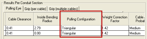 The relative position of the cables in the conduit in a multiple cable pull is important because it affects the weight and distribution of the cables and, therefore, affects the normal force between the cables and the conduit The position of a smaller neutral cable is disregarded in determining the pulling configuration for a pull with two cables. For a pull with two cables, a triangular configuration is assumed.