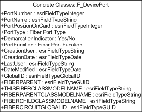 Attributes (required fields in red): PortNumber: long integer - This is the numeric position of the port following the Fiber Manager standard Object Position Rules. These start with the lowest number at the upper left hand corner and then move in a left to right order as each column and row is processed. The value in this field is usually the same as the PortName, but it is not required to be so. If a different or irregular port naming convention is used, then this can be captured with the PortName field. PortName: text - This field stores a value that refers to a port. This is typically an integer value (such as Port 18), but it is not required to be so. This field also allows an organization to skip port numbers, if necessary. PortPositionOnCard: long integer - This field determines the order in which ports are displayed on a patch panel card. Port Position 1 is the upper left corner and each port is drawn in a ‘typewriter’ order after that, depending on the number of rows and columns on the card. Numbering is explained in more detail in the Fiber Manager Numbering Scheme section. PortType: text - This stores the connector type that is used to plug into the port. Some common values that are stored in this field are SC, ST, FC and LC. The Fiber Port Type domain is assigned to this field. DemarcationIndicator: long integer - This field is used to indicate that a specific port marks a change in ownership between one organization (or internal group) and another. If this value is set to Yes, then the facilities on either side of the port have different owners. The Yes/No domain is assigned to this field. This is not a required field and can be deleted if not useful. PortFunction: text - This field can store the purpose of the port. The standard model lists valid values as primary transmit, primary receive, secondary transmit and secondary receive. These are how the ports are used, but this list can be expanded. For instance, a SONET Network Device may have ports labeled as “In” and “Out.” The Fiber Port Function domain is assigned to this field. This is not a required field and can be deleted if not useful. GlobalID: GlobalID - This field contains a unique number (GUID) that is generated and maintained by ArcGIS. This value is used for all relationships in the ArcFM data model and is required for Fiber Manager to function properly. FiberParent: GUID - This field contains the GlobalID of the parent object to the current object. ThisFiberClassModelName: text - This field stores the class model name assigned to the feature class on which the field resides. It is used in conjunction with the FiberParentClassModelName field to determine the GlobalID that will be placed in the FiberParent field. FiberParentClassModelName: text - This field stores the class model name assigned to the feature class that is the parent of the class on which the field resides. It is used in conjunction with the ThisFiberClassModelName field to determine the GlobalID that will be placed in the FiberParent field. FiberChildClassModelName: text - This field stores the class model name of a child object to the object on which the field resides. FiberCircuitGlobalID: GUID - Circuit Manager uses this field to store the GlobalID of the Circuit record stored in the Circuit Table.