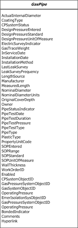 GasPipe is an abstract class.GasPipe is represented as a complex edge feature because multiple connections are made along its length. Because gas pipe is inspected regularly, GasPipe is associated with objects capturing related information that does not require a location on the network such as LeakReport.