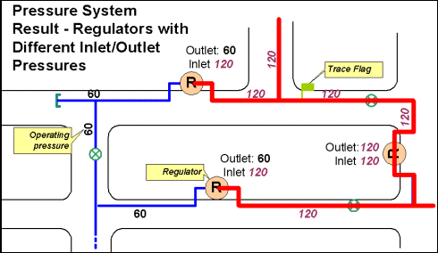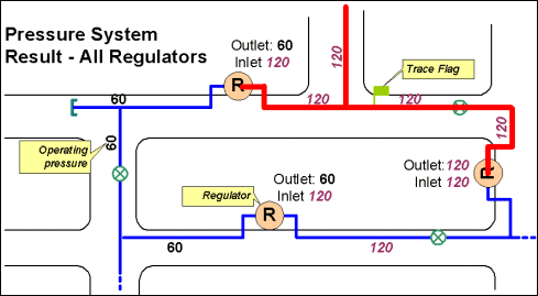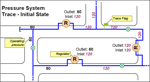 The purpose of this trace is to find connected features of equal operating pressures with two types of regulators acting as barriers: either all regulators or regulators with different inlet and outlet pressures. For the All Regulators option, the solver looks for junctions that have Bit 20 (Regulator) set. It sets these features as the barriers to the trace and performs the trace. For the Regulators with different inlet and outlet pressures option, the solver looks for junctions with both Bit 20 (Regulator) and Bit 17 (Gas Pressure System Boundary) set. For valves, the solver looks at only Bit 17.