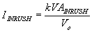 The magnitude of the inrush kVA for a motor is computed as the product of the motor's horsepower and a multiplier derived from its NEMA code rating. The resulting inrush current IINRUSH is computed as