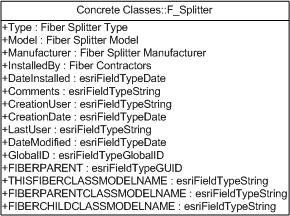Attributes (required fields in red): Type: text - This stores a broad classification for the splitter. This field is not used in any calculations, so it does not need to be limited by the domain values present in the standard data model. Users can remove the domain from this field or create and use a nonstandard domain. This field is not required and should only be kept if it is useful. The Fiber Splitter Type domain is applied to this field. Model: text - This is the manufacturer’s model or catalog number. This is not a required field and should only be kept if it is useful to store this information in your GIS. The Fiber Splitter Model domain is assigned to this field. Manufacturer: text - This is the name of the manufacturer of the splitter. This is not a required field and should only be kept if it is useful to store this information in your GIS. The Fiber Splitter Manufacturer domain is assigned to this field. InstalledBy: text - This is the name of the group or organization that installed the splitter. This field was intended to store the names of contractors, but it could also be used to track the individual employees or internal operations and maintenance groups. This is not a required field and should only be kept if it is useful to store this information in your GIS. The Fiber Contractors domain is assigned to this field. DateInstalled: date - This is the date when the splitter was installed in the field. This is not a required field and should only be kept if it is useful to store this information in your GIS. GlobalID: GlobalID - This field contains a unique number (GUID) that is generated and maintained by ArcGIS. This value is used for all relationships in the ArcFM data model and is required for Fiber Manager to function properly. FiberParent: GUID - This field contains the GlobalID of the parent object to the current object. ThisFiberClassModelName: text - This field stores the class model name assigned to the feature class on which the field resides. It is used in conjunction with the FiberParentClassModelName field to determine the GlobalID that will be placed in the FiberParent field. FiberParentClassModelName: text - This field stores the class model name assigned to the feature class that is the parent of the class on which the field resides. It is used in conjunction with the ThisFiberClassModelName field to determine the GlobalID that will be placed in the FiberParent field. FiberChildClassModelName: text - This field stores the class model name of a child object to the object on which the field resides.