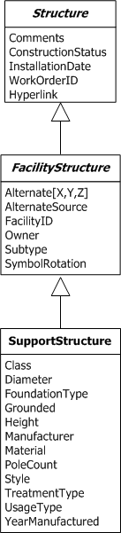 SupportStructure features can have streetlights, assemblies, and other attachments associated with them. SupportStructure inherits attributes from the abstract classes Structure and FacilityStructure. Any model names assigned to these classes should be assigned to SupportStructure as well.